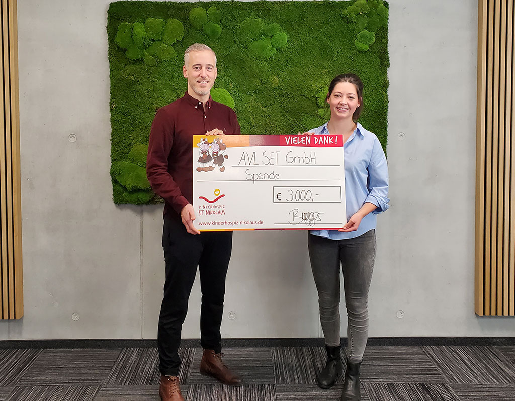 Die AVL SET GmbH aus Wangen hat sich auch dieses Jahr dazu entschieden, auf Kundengeschenke zu verzichten und den Betrag an einen guten Zweck zu spenden. Den Spendenscheck überreichte der Geschäftsführer Dr. Tobias Schelter an Alina Niederberger, Vertreterin des Kinderhospiz, die sich herzlichst für die wiederholte Unterstützung bedankte.