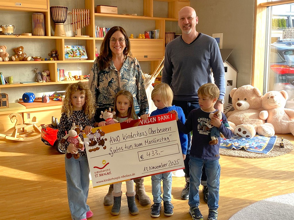 “Gutes tun” lautetet das Projekt, das das AWO Kinderhaus Oberbeuren zum Sankt Martinstag am 11. November 2025 initiiert hat. Vorschulkinder haben Baumkerzen mit Wachs verziert und dann am Martinstag tagsüber zusammen mit einer Karte mit einem kleinen Spruch an Passanten in der Kaufbeurer Innenstadt verteilt. Die Passanten haben freiwillig Geld dafür gegeben. Abends bei der Martinsfeier wurde Punsch ausgeschenkt, ebenfalls gegen Spende. Bei dieser Aktion kamen 433 Euro zusammen, die das AWO Kinderhaus jetzt als Spende an das Kinderhospiz St. Nikolaus in Bad Grönenbach übergeben hat.