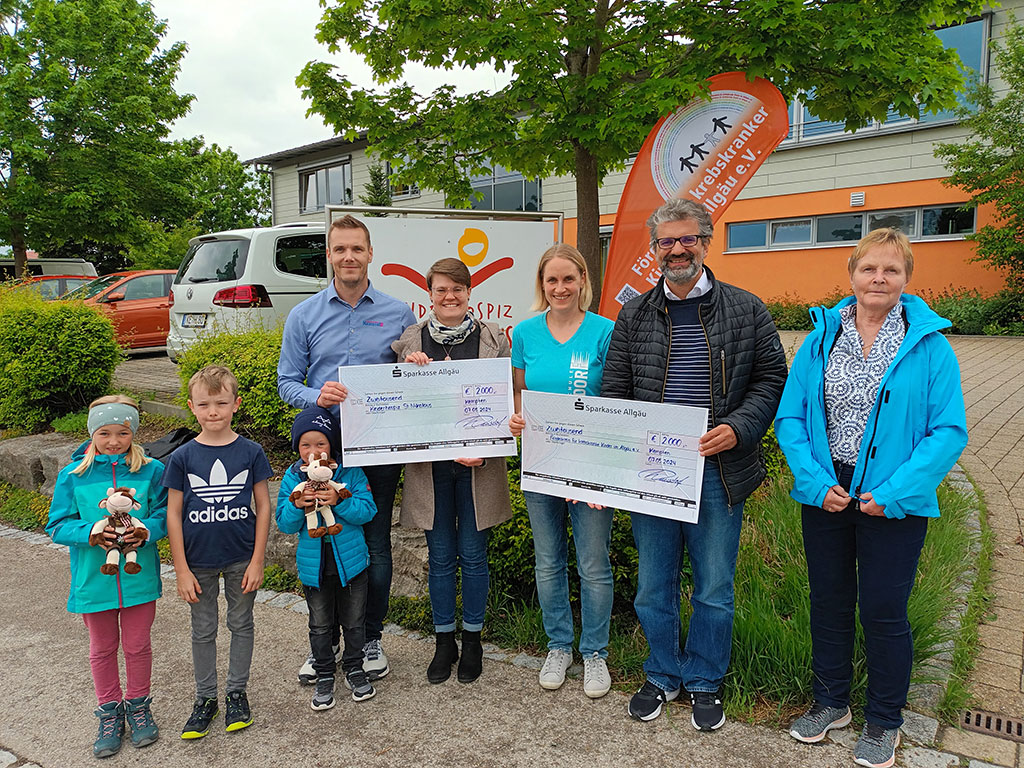 Familie Hausdorf übergab an Martina Wersig vom Kinderhospiz einen Scheck von 2.000 Euro. Auch der Förderverein krebskranker Kinder e.V., vertreten durch Stephan Barthzack, erhielt eine Spende von 2.000 Euro. Die gemeinsame Spendenübergabe fand direkt vor dem Kinderhospiz St. Nikolaus in Bad Grönenbach statt. Familie Hausdorf kam mit dem LKW angefahren, da sie die Fahrschule Hausdorf betreibt. Der LKW wurde von vielen kleinen Gästen bestaunt. Vielen Dank für die tolle Spendenübergabe.