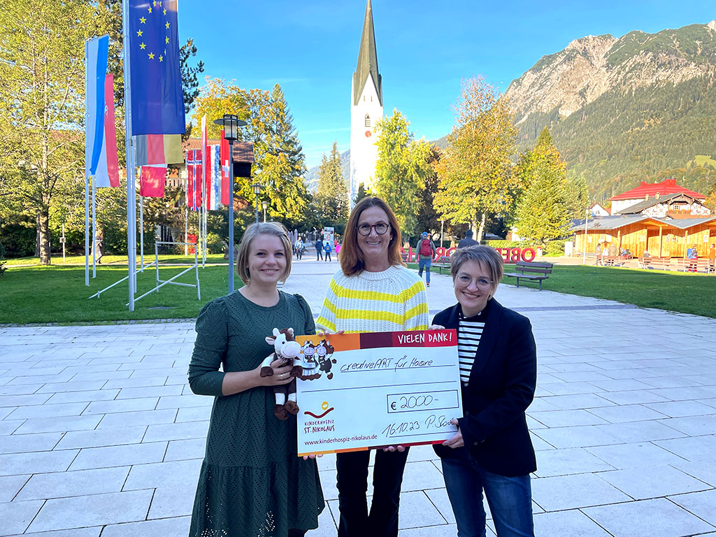 Mit einem unvergesslichen Sommerfest und einer großzügigen Spende für das Kinderhospiz St. Nikolaus verabschiedete sich Petra Stocker, Inhaberin von creativeART für Haare bei ihren Kundinnen und Kunden und bedankte sich für 19 Jahre Treue. Über 100 Besucherinnen und Besucher kamen im August zu dem großen Abschiedsfest. Die Bandmitglieder der Montafoner Mundart- Band „Krauthobel“ Jürgen und Mike begeisterten mit besten Blues-, Folk- und Rocksongs die geladenen Gäste. Die beiden spielten bereits zum siebten Mal in den Räumlichkeiten des Friseursalons. Petra Stocker und ihr Team haben nicht nur durch ihre Kreativität und ihr besonderes Haarstyling ihrem Namen alle Ehre gemacht, sondern auch durch besondere Charity-Aktionen, wie Haare schneiden auf dem Gruben Grooves und der 100-Jahr-Feier der Bergwacht. Dabei sammelte das engagierte creativeArts-Team 500 Euro an Spenden für die Bergwacht Oberstdorf und mit dem Erlös des Sommerfestes und der Sommerfest-Tombola 2000 Euro für das Kinderhospiz St. Nikolaus in Bad Grönenbach.