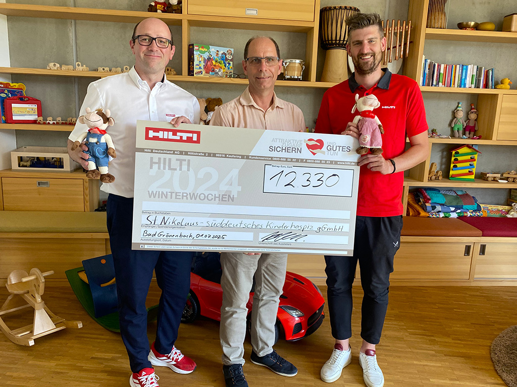 Martin Kößl und Sebastian Mayer von der Hilti Deutschland AG kamen persönlich nach Bad Grönenbach ins Kinderhospiz St. Nikolaus, um eine Spende von 12.330 Euro zu übergeben. Die Spende wurde zum wiederholten Male bei den Winterwochen gesammelt, die die Firma organisiert. In den Winterwochen sammelt Hilti bei jedem Kundenauftrag 5 Euro, um anschließend die gesammelte Summe an eine soziale Einrichtung zu spenden. Alfons Regler, Geschäftsführer des Kinderhospizes, freute sich sehr über den Besuch und das Engagement und bedankte sich ganz herzlich.