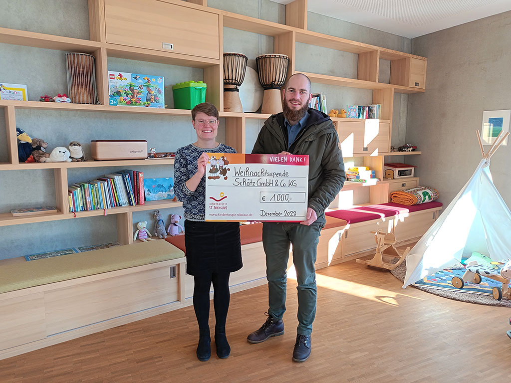 Die Firma Schätz GmbH & Co. KG, Technischer Grosshandel, aus Herbisried unterstützt nun zum siebten Mal das Kinderhospiz St. Nikolaus mit einer Weihnachtsspende. Die jährlichen Weihnachtsgrüße an Kunden, Lieferanten und Freunde versendet die Firma mit den selbst gezeichneten Weihnachtskarten vom Kinderhospiz. Geschäftsführer Daniel Wegmann kam wieder vorbei, um die Spende von 1.000 Euro persönlich an Martina Wersig vom Kinderhospiz zu übergeben. Sie bedankte sich für die treue Unterstützung im Namen des gesamten Teams.