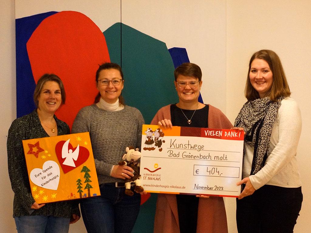 Zum Abschluss der KunstWege Bad Grönenbach wurden im Rahmen der Finissage fünf Kunstwerke für den guten Zweck versteigert. Zwei Künstler, Tobias Hammel und Jan Nystrom, sowie drei Laienmalerinnen und -maler, unter anderem Bürgermeister Bernhard Kerler, hatten bei der Aktion "Bad Grönenbach malt" große und kleine Kunstwerke auf Leinwand und Papier geschaffen. Diese brachten Galeristin Ruth Steffny und Benita Prinz-Helmle von der Kur- und Gästeinformation während einer unterhaltsamen Versteigerung meistbietend an den Mann beziehungsweise an die Frau. So wurde eine Summe von 404 Euro gesammelt. Die Spende wurde nun an das Kinderhospiz St. Nikolaus in Bad Grönenbach übergeben. Martina Wersig, als Vertreterin des Kinderhospizes, nahm das Geld erfreut entgegen.