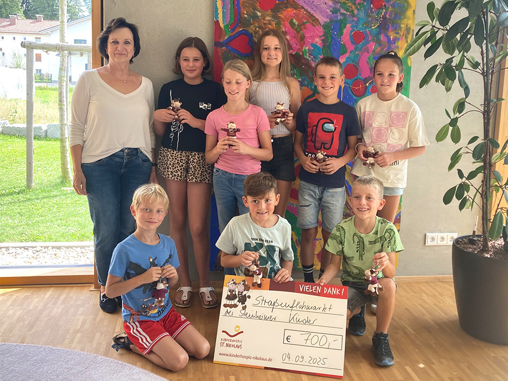 Acht Mädels und Jungs, die Am Wallersteig und Am Zollsteig in Memmingen wohnen, haben in den Sommerferien mit einem Straßenflohmarkt Spenden in Höhe von 700 Euro gesammelt. Die Kinder haben ihre Spende jetzt persönlich dem Kinderhospiz St. Nikolaus in Bad Grönenbach überreicht. Karin Männer vom Kinderhospiz bedankte sich herzlich für die tolle Spende, bei der sich Kinder ganz großartig für unser Kinderhospiz eingesetzt haben.