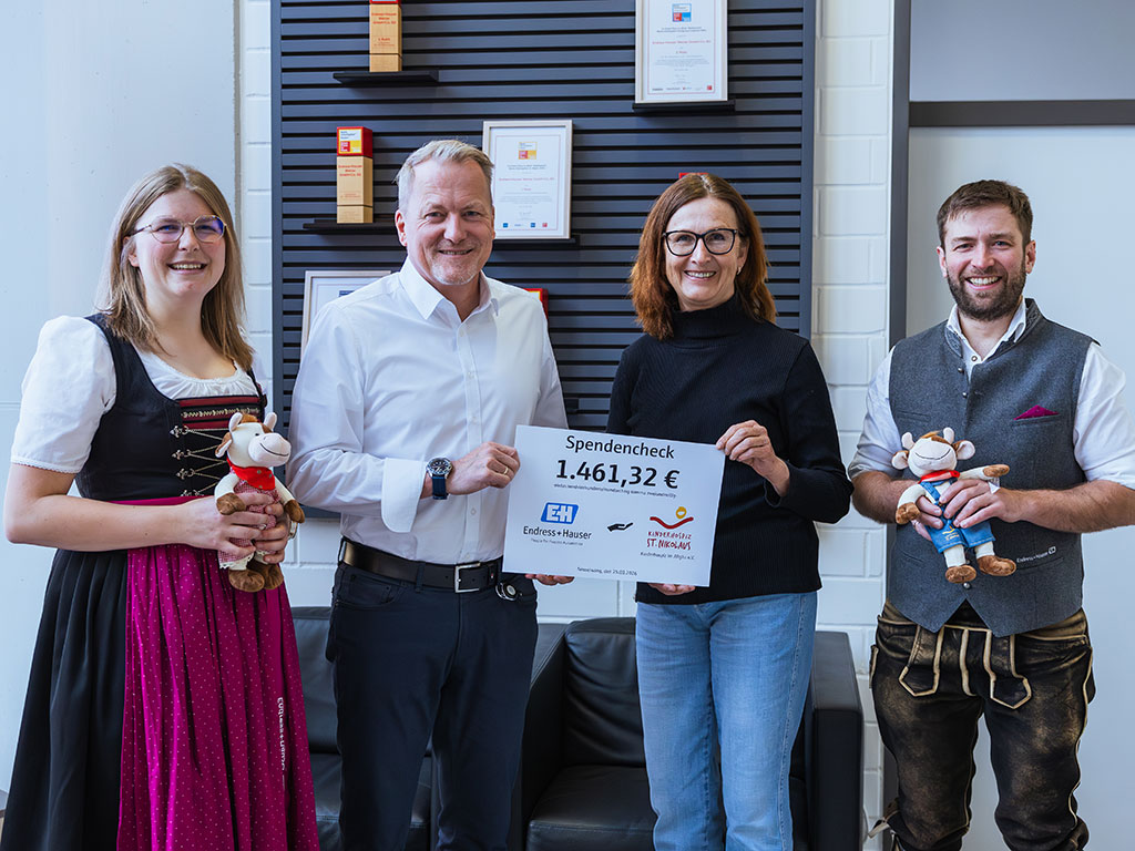 Mit Trompeten- und Posaunenklängen ist die „Wetzer Kapelle“ zu Jahresbeginn erneut durch die Büros am Endress+Hauser Standort Nesselwang gezogen. Der musikalische Rundgang hat sich im Laufe der Jahre zu einer festen Tradition entwickelt und verbindet den Auftakt ins neue Jahr mit sozialem Engagement. Aus vielen kleinen freiwilligen Beiträgen der Mitarbeitenden kam eine Spendensumme von 730,66 Euro zusammen. Die Geschäftsleitung verdoppelte diesen Betrag auch in diesem Jahr, sodass insgesamt 1461,32 Euro zusammenkamen. Die Spende wurde nun persönlich an das Kinderhospiz im Allgäu e.V. übergeben. Die Aktion unterstreicht die Bedeutung gemeinschaftlichen Engagements bei Endress+Hauser. Gerade in Zeiten wachsender gesellschaftlicher Herausforderungen ist es wichtig, lokale Vereine und Initiativen zu unterstützen, wo immer es möglich ist.