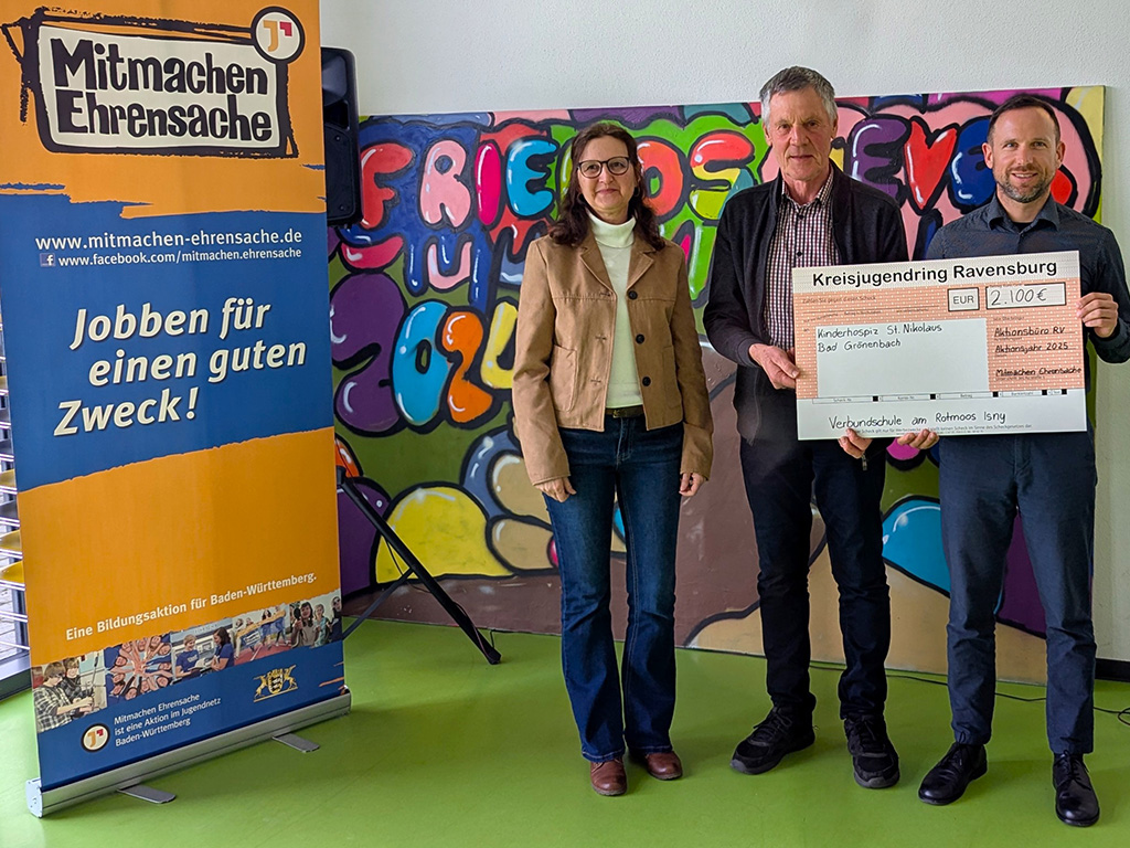 Den krönenden Abschluss der Aktion bildete eine gemeinsame Veranstaltung an der Gemeinschaftsschule Argenbühl in Eglofs. In festlichem Rahmen wurden dort die Spendengelder an insgesamt 22 soziale Einrichtungen übergeben. Nach der offiziellen Abrechnung durch den Kreisjugendring Ravensburg im März 2026 stand nun der finale Spendenstand fest: Die Schülerinnen und Schüler der Verbundschule am Rotmoos haben stolze 2.100 Euro erarbeitet! Dieser Betrag kommt, wie von den Klassen vorab entschieden, unserem Kinderhospiz St. Nikolaus in Bad Grönenbach als Spende zugute. Johannes Buhmann, ehrenamtlicher Mitarbeiter des Kinderhospizes, nahm die Spende äußerst dankbar entgegen.