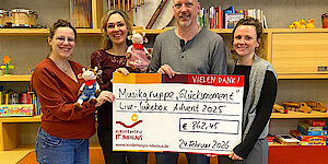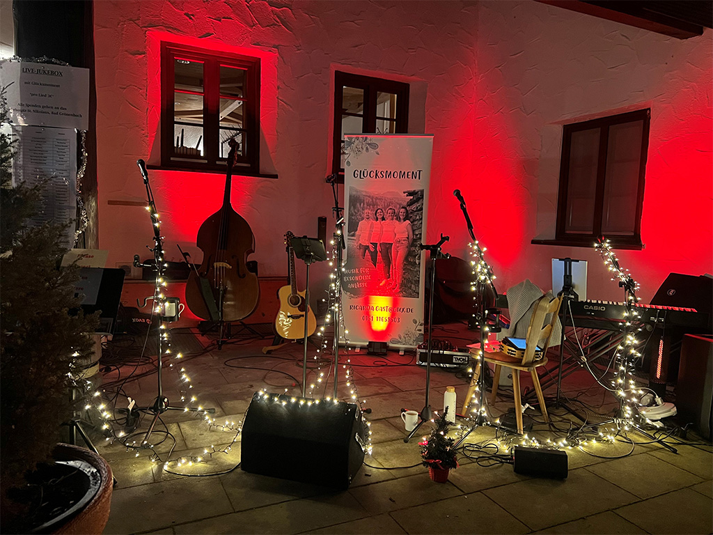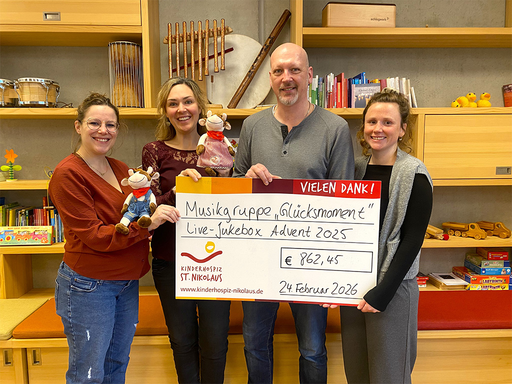 Auch wenn die Weihnachtszeit bereits etwas zurückliegt, konnte die Gruppe “Glücksmoment” bei ihrem jüngsten Besuch im Kinderhospiz St. Nikolaus in Bad Grönenbach kürzlich eine Spende in Höhe von 862,45 Euro überreichen. Wie im Jahr zuvor hatten die vier Musiker an zwei Veranstaltungen ihre Live-Jukebox aufgebaut. Diese fand am 23. November 2025 beim Adventsbasar in Haslach und am 13. Dezember 2025 beim Weihnachtsmarkt in Oy statt. Jeweils 30 Lieder standen zur Auswahl und die Musikwünsche der Besucher wurden gegen eine Spende von 3 Euro pro Lied erfüllt. Neben modernen Liedern wie dem meistgewünschten “Shallow” von Lady Gaga wurden auch traditionelle Weihnachtslieder wie “Stille Nacht, Heilige Nacht” und “Ihr Kinderlein, kommet” gewünscht.