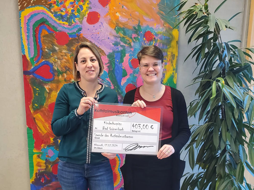 Die Rothtalmusikanten Oberroth e.V. haben am 17. Dezember 2023 ein Weihnachtskonzert veranstaltet und hierbei Spenden gesammelt, die zu gleichen Teilen an das Kinderhospiz und die eigene Jugendarbeit aufgeteilt wurde. Nun konnte eine Spende von 403,- Euro von Kathrin Burger (li.) an Martina Wersig übergeben werden, die sich ganz herzlich für die Unterstützung bedankte.