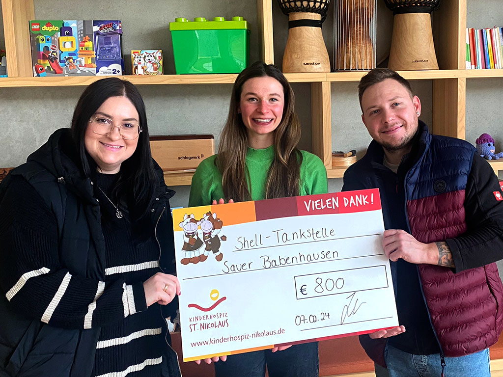 Jasmin und Kevin Chornet Martinez von der Shell Tankstelle Sauer in Babenhausen haben eine Spende von 800 Euro an Luisa Miorin (Mitte) vom Kinderhospiz St. Nikolaus übergeben. Kunden der Tankstelle spendeten im letzten Jahr pro Toilettengang 50 Cent und so kam letztendlich die Spendensumme zusammen. Luisa Miorin bedankte sich für die erneute Unterstützung ganz herzlich, auch im Namen der betroffenen Familien.