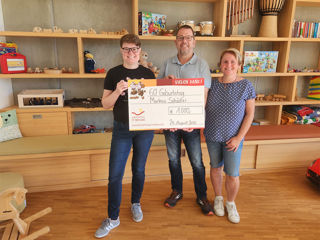 Markus Schädler aus Dettingen feierte im Juli seinen 60. Geburtstag. Anstelle von Geschenken bat er um eine Spende für das Kinderhospiz St. Nikolaus in Bad Grönenbach. Hierbei kam eine stolze Summe von 800 Euro zusammen, die Markus Schädler auf 1.000 Euro aufrundete. Gemeinsam mit seiner Frau Marion Schädler kam er nach Bad Grönenbach, um die Spende persönlich zu übergeben.