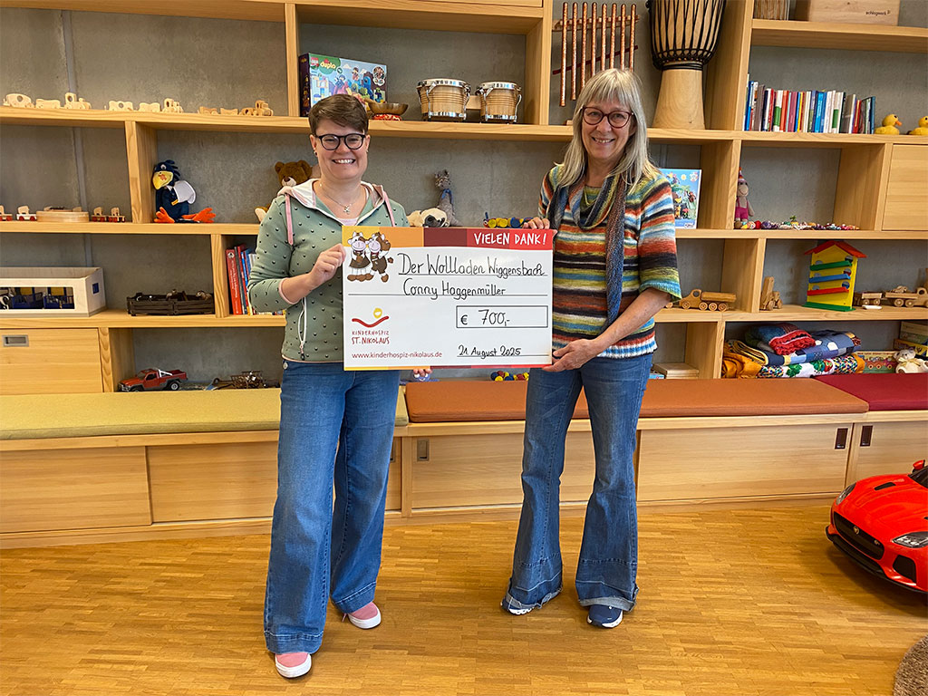 Conny Haggenmüller, Inhaberin des Wollladens in Wiggensbach, kam persönlich nach Bad Grönenbach, um zum wiederholten Male eine Spende von 700 Euro an Martina Wersig vom Kinderhospiz St. Nikolaus zu übergeben. Sie strickt leidenschaftlich gern Kleidungsstücke wie Schals, Tücher und Mützen und verkauft diese zugunsten des Kinderhospiz St. Nikolaus auf verschiedenen Märkten. Martina Wersig freute sich sehr über den Besuch und bedankte sich ganz herzlich für das Engagement und die jahrelange wertvolle Unterstützung.