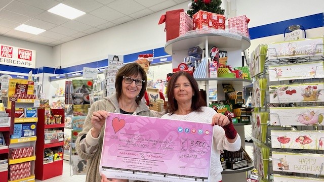 Der Tabakshop Fröhlich sammelt bereits seit mehreren Jahren Geld für das Kinderhospiz St. Nikolaus. In der "KinderKasse" können Kundinnen und Kunden Kleingeld spenden. Der Tabakshop hat den Betrag aufgerundet und eine tolle Spende von 3.500 Euro ist zusammengekommen. Das Team des Kinderhospiz bedankt sich herzlich für das tolle Engagement und Loyalität.
