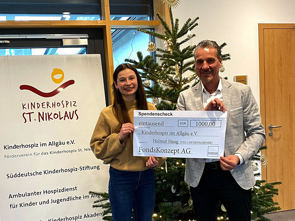 Nicht nur reden, sondern aktiv Gutes tun und der Gesellschaft vom eigenen Erfolg etwas zurück zu geben, sind für viele Menschen besonders in der Weihnachtszeit ein Anliegen. Die Kemptener Finanzberatung Villa am Denzlerpark hat dies zum Anlass genommen und aus dem Spendenpool ihres Illertissener Verbundspartners FondsKonzept AG 1.000 Euro an das Kinderhospiz St. Nikolaus gespendet. Die Institution wurde als eine von 15 sozialen Einrichtungen im Rahmen eines deutschlandweiten Bewerbungs- und Losverfahrens unter den Verbundmaklern der FondsKonzept ausgewählt.